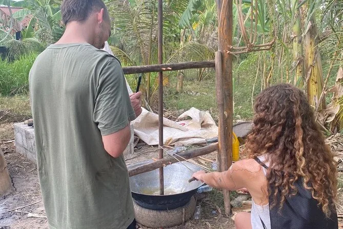 Einmal hielten wir unter einer Palme an, weil Dara uns zeigen wollte, wie Klebreis in Bambus gegart wird. Er reichte uns ein Stück – noch warm – das süß und rauchig zugleich schmeckte. In der Nähe saß eine Frau, die Körbe flocht; sie ließ uns probieren (ich war total ungeschickt) und lachte herzlich mit uns. Die ganze Umgebung war so still, nur das Summen der Insekten und das leise Klacken der Fahrradreifen auf dem Boden waren zu hören.