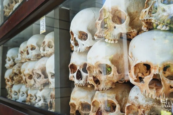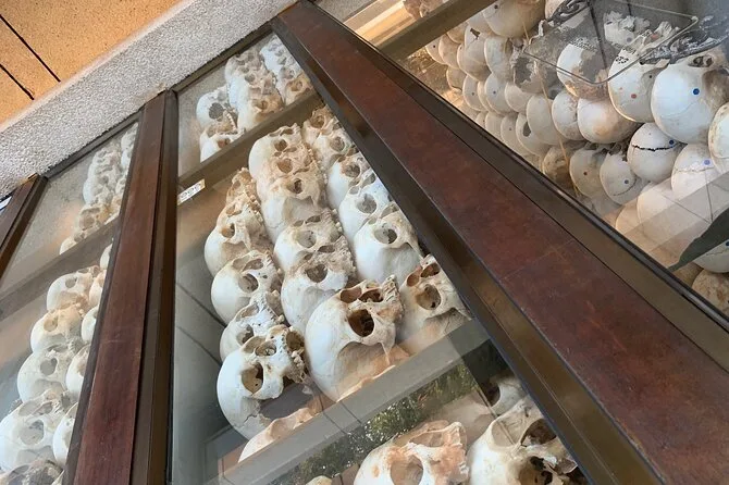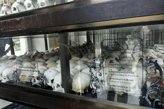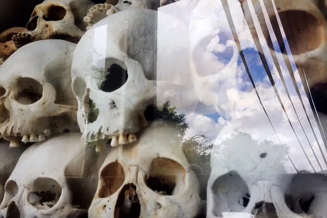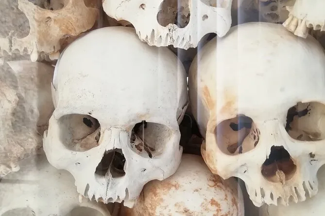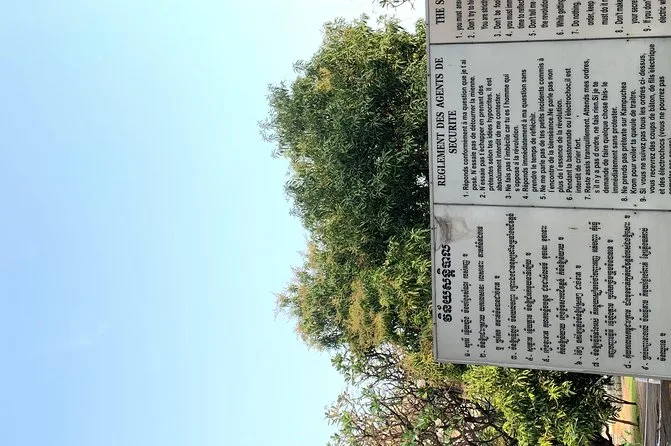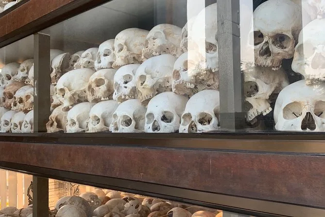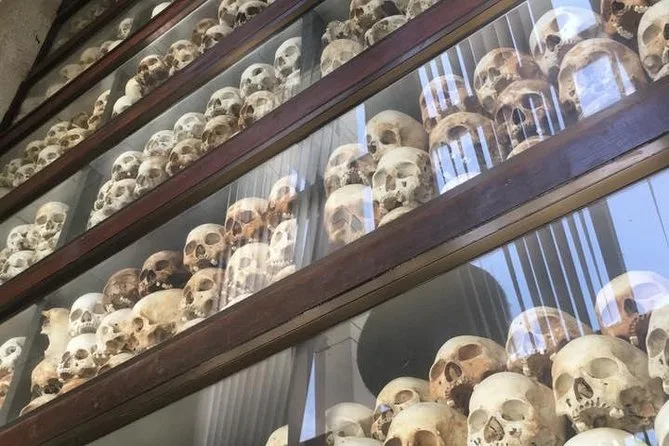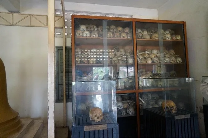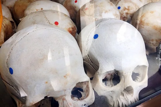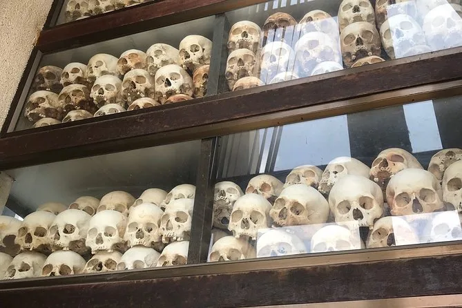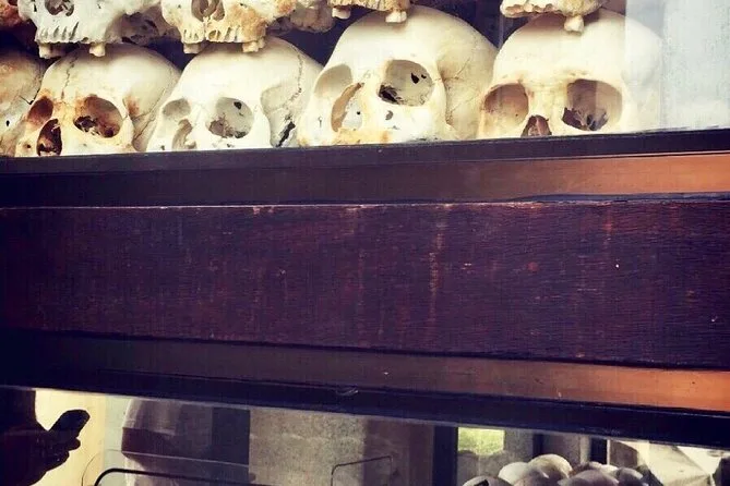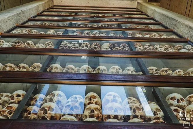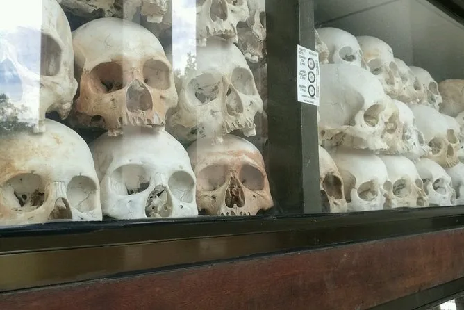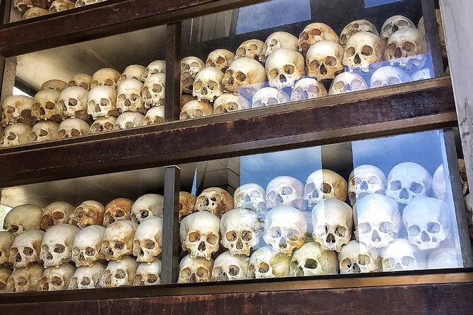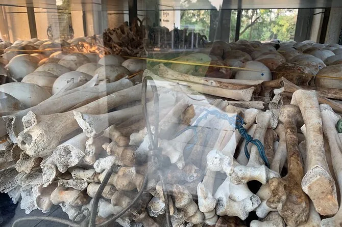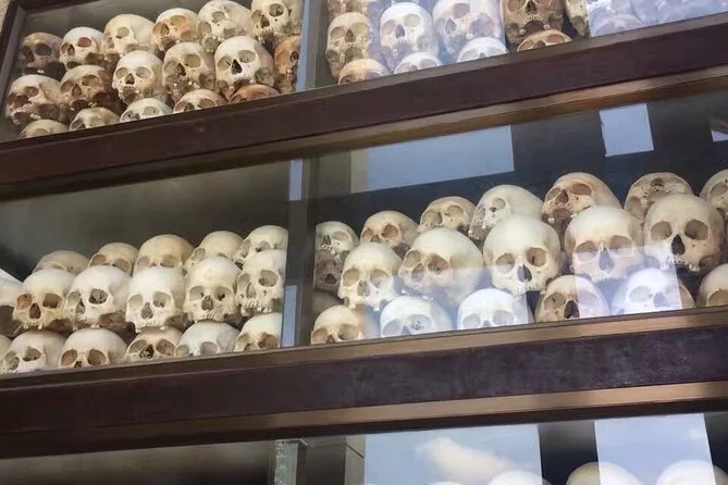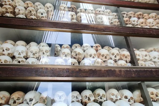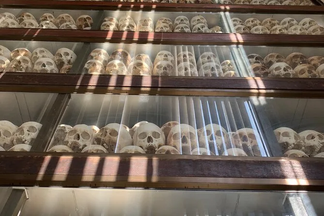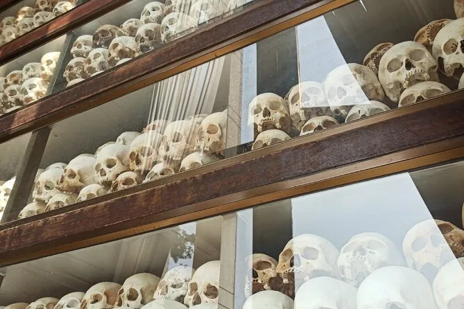 Der Nachmittag wurde ernster. Das Tuol Sleng Genozid-Museum ist kein leichter Ort – ehemalige Klassenzimmer wurden zu Gefängniszellen, verblasste Fotos hängen an den Wänden. Dara ließ uns Zeit, in Ruhe zu gehen, ohne zu hetzen. Danach fuhren wir zu den Killing Fields von Choeung Ek – Vogelgezwitscher und Sonnenlicht kontrastieren mit Glasvitrinen voller Schädel, die einen erstarren lassen. Worte können kaum beschreiben, was man dort fühlt. Zum Glück war Dara da, um Fragen zu beantworten, ohne dass es wie ein trockener Geschichtsunterricht wirkte.
