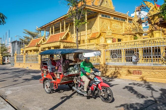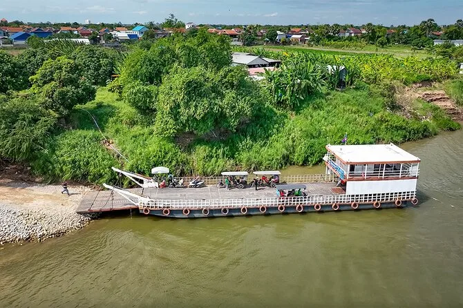 Du fährst mit dem Tuk-Tuk von Phnom Penh und überquerst den Mekong mit der Fähre.