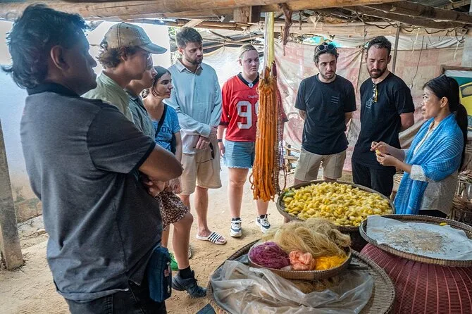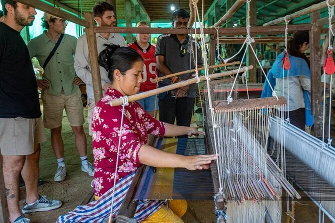 Das Webhaus war ruhiger als erwartet, nur das sanfte Klackern der Holzwebstühle war zu hören. Eine der Frauen ließ mich rohe Seidenfäden anfassen – viel weicher als Baumwolle, aber irgendwie auch stärker. Sie zeigte uns, wie jeder Schal Tage braucht, bis er fertig ist; ihre Hände flogen so schnell, dass mir schwindelig wurde. Dara übersetzte ihre Geschichte, wie sie von ihrer Mutter gelernt hat – in ihrer Stimme lag so viel Stolz, ganz ohne Worte. Wir saßen eine Weile, tranken kaltes Wasser (das tat gut) und schauten einfach zu, wie das Sonnenlicht durch die Bambuswände tanzte.