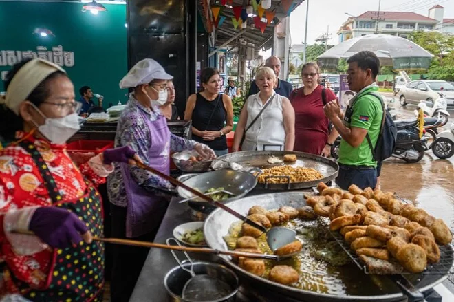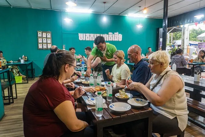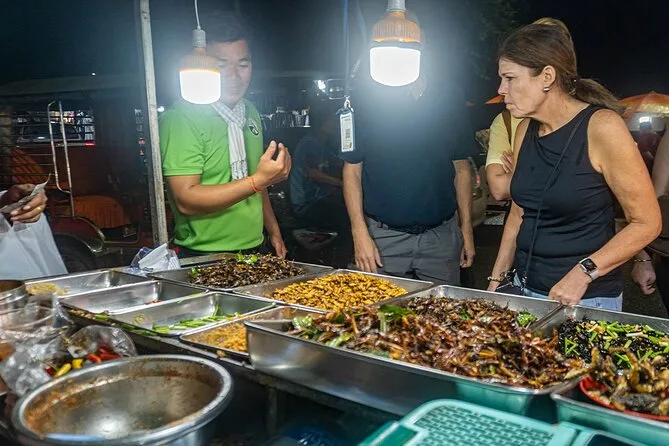 Du probierst kambodschanische gebratene Reisnudeln, Frühlingsrollen, Tofu, BBQ-Schnecken, Curry-Nudelsuppen, gegrilltes Hähnchen, Früchte – und wenn du mutig bist, sogar frittierte Insekten.