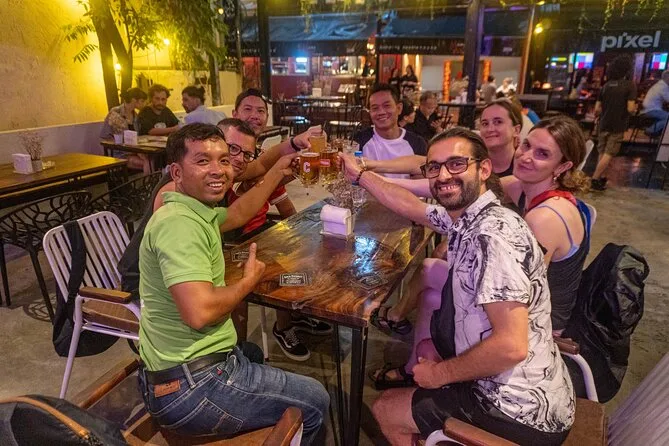 Der letzte Markt war lauter – Kinder rannten barfuß herum, Verkäufer riefen Preise, und vom Grill stieg Rauch auf, wo Hähnchenspieße direkt am Straßenrand brutzelten. Dara forderte uns auf, frittierte Insekten zu probieren (ich habe nach einem Bissen aufgegeben), aber dazu ein eiskaltes Getränk auf einer Matratze am Straßenrand zu genießen, fühlte sich irgendwie perfekt an. Zum Abschluss ging’s in Long’s Bar auf ein frisch gezapftes Bier; Dara beantwortete geduldig all unsere Fragen zum Leben in Siem Reap, bis es Zeit war, durch die Lichter der Stadt zurückzufahren. Manchmal denke ich noch an diese Nudeln oder einfach an das Gefühl, durch die warme Nachtluft zu cruisen, ohne irgendwo anders sein zu müssen.