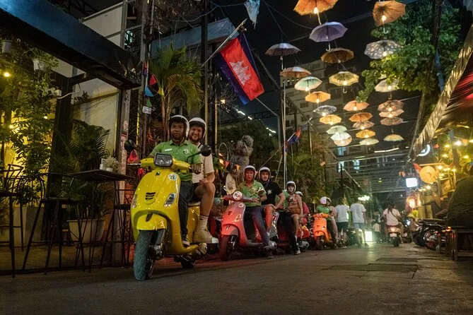 Erlebe Siem Reaps lebendige Straßen auf einer Vintage Vespa, koste gebratene Reisnudeln bei Lort Cha, entdecke bunte Märkte mit Handwerk und Snacks, probiere BBQ-Schnecken und Curry-Nudeln und lass den Abend mit kühlen Drinks auf dem Nachtmarkt und in Long’s Bar ausklingen – inklusive Hotelabholung und einem entspannten Guide, der dich wie zu Hause fühlen lässt.
