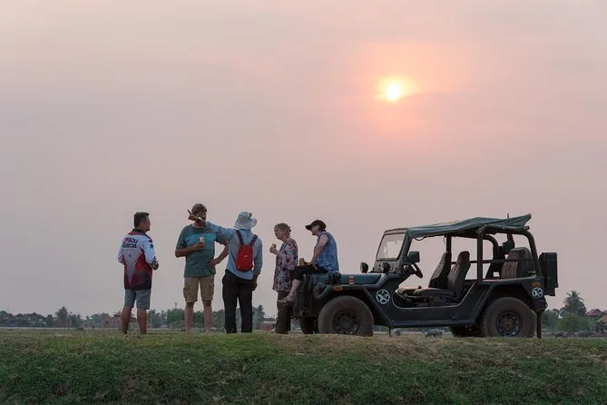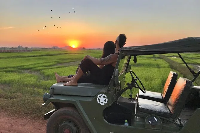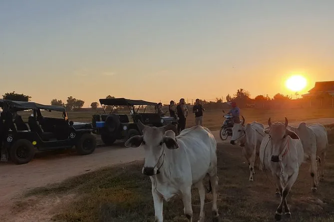 Dein Tag startet mit der Abholung vom Hotel in Siem Reap, danach geht es mit offenem Jeep und einem englischsprachigen lokalen Guide über Landstraßen. Du bekommst Wasser zum Frischhalten, Snacks für zwischendurch und zum Sonnenuntergang alkoholische Getränke, bevor es am frühen Abend zurück in die Stadt geht.
