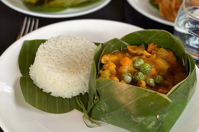 Dein halbtägiges Erlebnis beinhaltet die Abholung und Rückfahrt vom Hotel in Siem Reap mit dem Tuk-Tuk, alle Zutaten für drei klassische kambodschanische Gerichte (Frühlingsrollen, Curry, Bananen in Palmzucker), Wasserflasche und kaltes Tuch bei Ankunft, praktische Anleitung durch eine lokale Köchin in einer Dorfkulisse sowie ein Rezeptheft zum Mitnehmen nach dem gemeinsamen Mittagessen.