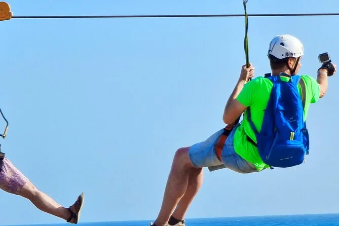 Im Erlebnis sind Hoteltransfer, komplette Sicherheitsausrüstung, ein lokaler Aperitif 100 Meter über dem Meer und Livemusik enthalten.