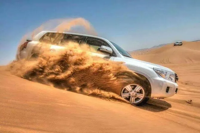 Die Tour umfasst einen Kamelritt (4–7 Minuten), Dünenfahren mit erfahrenen Fahrern und einen Besuch am Khor Al Udaid (Inlandsee).