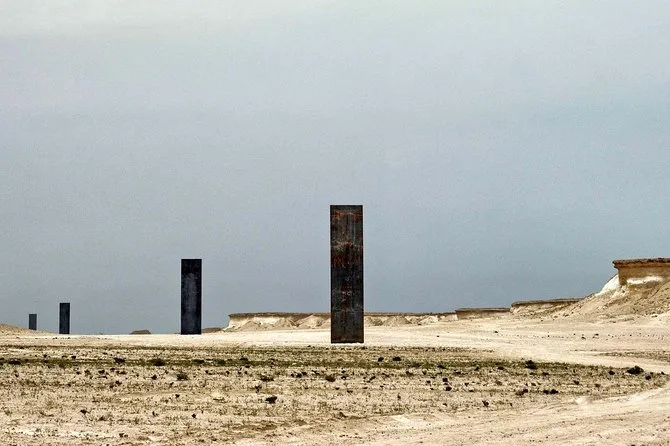 Der eigentliche Überraschungsmoment war für mich die Skulptur von Richard Serra im Brouq Naturschutzgebiet. Vier Stahlplatten, so hoch wie Gebäude, die sich über einen Kilometer Sand erstrecken. Irgendwie berührend, ehrlich gesagt. Man läuft zwischen ihnen hindurch, und die Hitze reflektiert vom Metall, sodass man sie auf den Armen spürt. Ein Wind pfiff durch eine Lücke, der mich länger innehalten ließ als erwartet. Jemand aus unserer Gruppe versuchte ein Selfie, lachte dann aber nur darüber, wie winzig er neben diesen riesigen Stahlplatten wirkte.