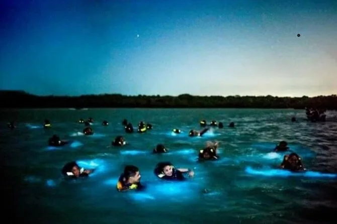 Weiter ging’s nach Cholon – überall Musik, Boote aneinandergebunden wie eine schwimmende Partymeile. Jemand reichte mir einen Garnelencocktail im Plastikbecher (würzig, frisch – viel besser als erwartet), während unsere Gruppe versuchte, sich über den Reggaeton hinwegzuschreien. Danach machten wir einen kurzen Stopp zum Schwimmen an Agua Azul – die Farbe ist wirklich beeindruckend – und schließlich landeten wir gegen 13:30 Uhr zum Mittagessen an der Playa Tranquila auf Barú. Gebratener Fisch, Kokosreis… einfach, aber genau richtig nach dem Vormittag im Wasser. Einige blieben bis zum Sonnenuntergang für das Plankton-Highlight; ich hätte fast mitgemacht.
