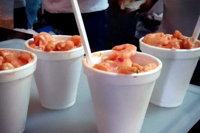 Die Tour beinhaltet eine Verkostung von Garnelencocktail in Cholon und ein Mittagessen (meist gebratener Fisch mit Kokosreis) an der Playa Tranquila auf Barú.