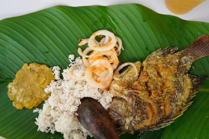 Du bekommst traditionelle karibische Gerichte wie Kokosreis, gebratenen Fisch oder Hühnchen sowie lokale Beilagen wie Enyucado (Maniok-Kuchen).