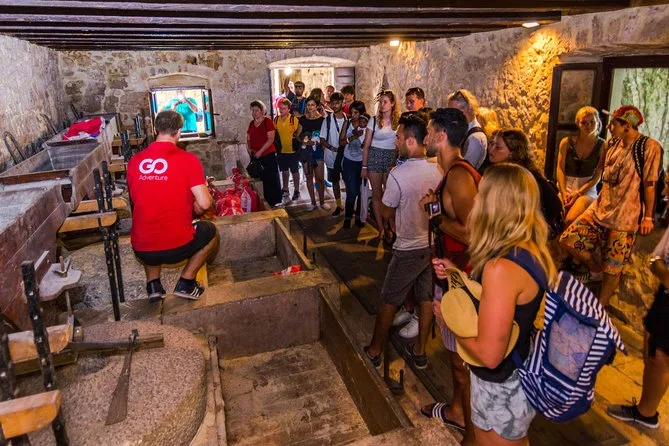 In Skradin angekommen, verteilte Ana unsere Eintrittskarten für die Krka-Wasserfälle, sodass wir nicht anstehen mussten (ehrlich, die Schlange sah echt lang aus). Beim Einsteigen ins Boot lag ein leichter Duft von Flusswasser und Wildblumen in der Luft. Die Fahrt war gemütlich, man hörte das Motorengeräusch und Kinder zeigten begeistert auf Reiher am Ufer. Ich hatte nicht erwartet, wie laut der Skradinski Buk aus der Nähe sein würde – nicht beängstigend, sondern eher so ein alles einnehmendes Rauschen, das dich dein Handy vergessen lässt. Ana führte einige von uns auf einem kurzen Spaziergang über Holzstege und vorbei an alten Wassermühlen (wusstest du, dass hier Teslas erste Wasserkraftanlage stand?). Die anderen nutzten die Zeit, um auf eigene Faust zu erkunden oder ein schattiges Plätzchen zu suchen.