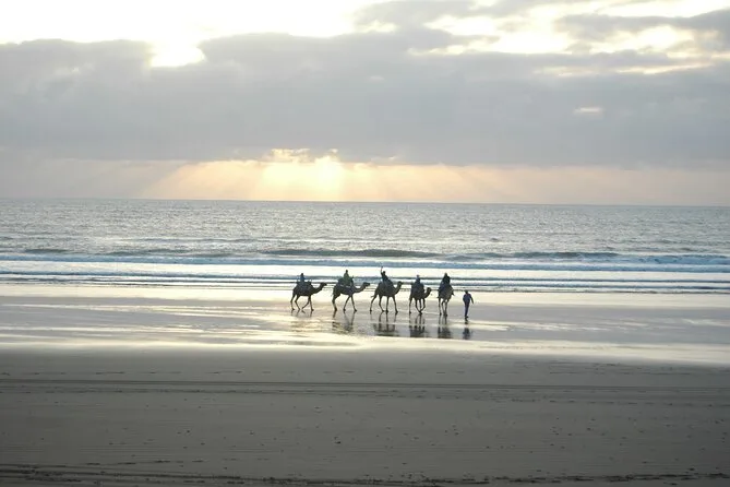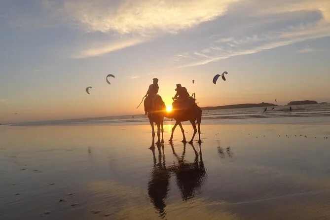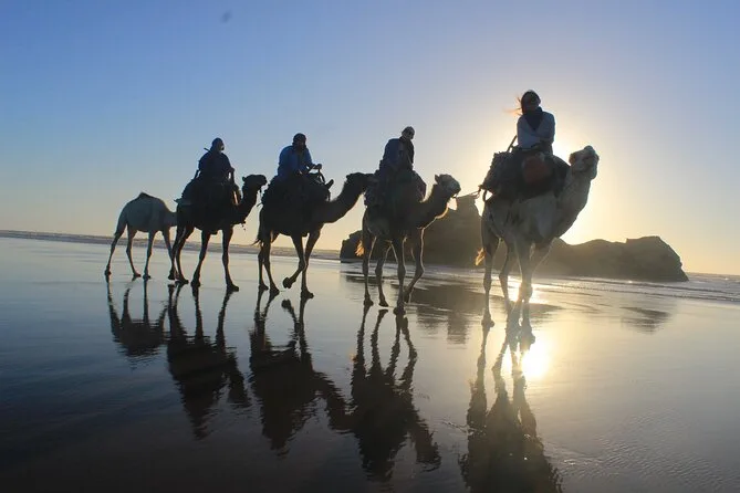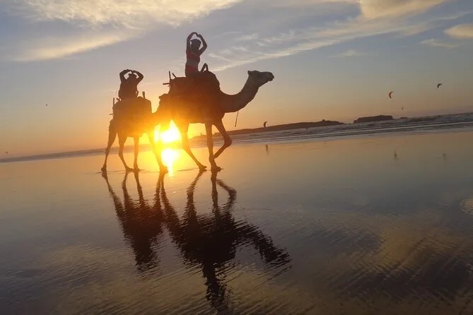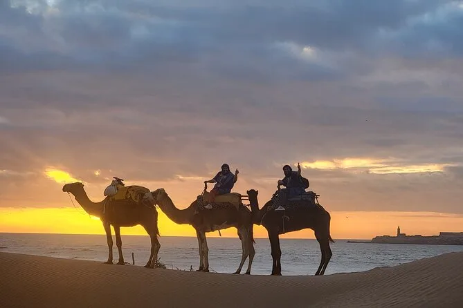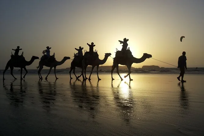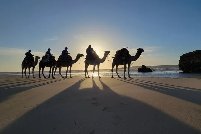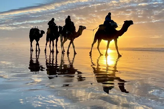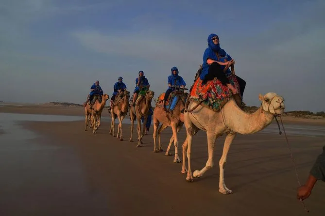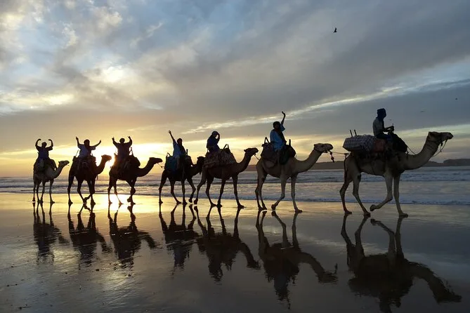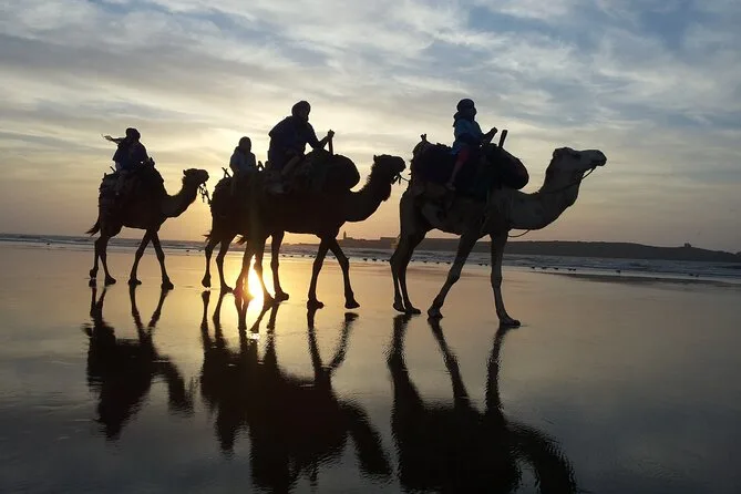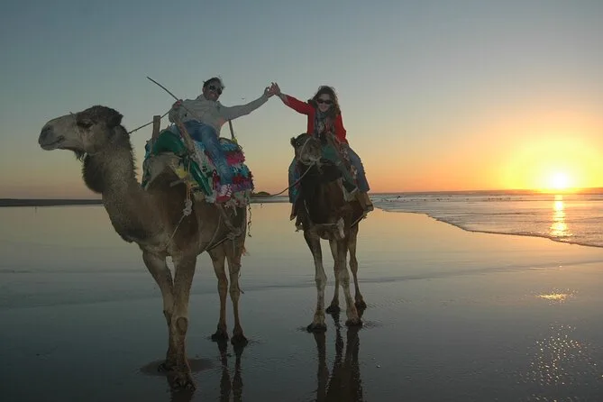 Erlebe einen Kamelritt entlang wilder Strände bei Essaouira, durch Eukalyptuswälder und vorbei an alten Sultan-Ruinen. Genieße ein Picknick mit hausgemachtem Brot, Kuchen, Tee und Arganöl mit deinem lokalen Guide. Wenn die Sonne über Dünen und Meer untergeht, spürst du diese besondere Ruhe – und wünschst dir, der Moment würde nie enden.