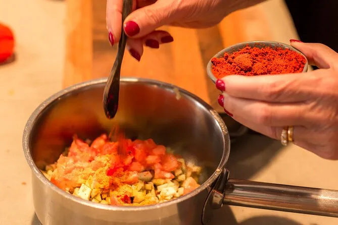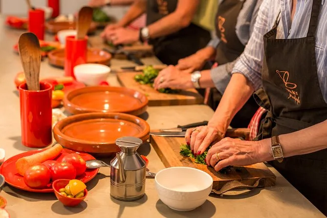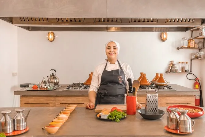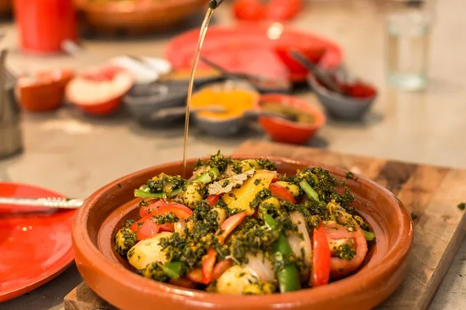 Dein Tag beinhaltet fachkundige Anleitung durch einen lokalen Koch auf Englisch und Französisch, einen praktischen marokkanischen Kochkurs mit frischen Zutaten vom Gewürzmarkt Essaouira sowie ein gemeinsames zweigängiges Mittagessen im orientalischen Salon, bevor du wieder in die Stadt aufbrichst.