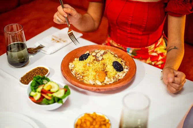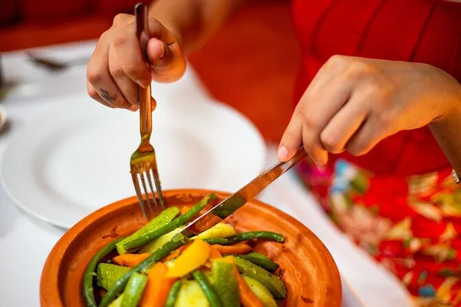 Traditionelle marokkanische Gerichte wie Tajine, Couscous, frische Salate und Minztee werden serviert.