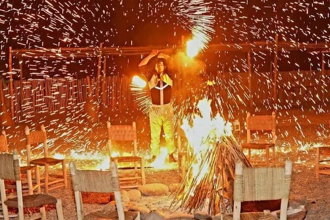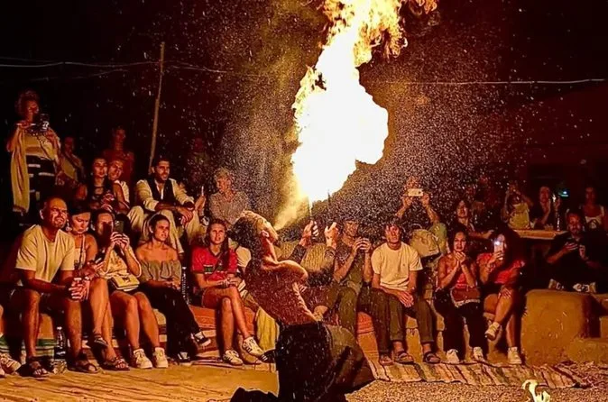 Das Abendessen fand draußen unter niedrigen Laternen statt, die Luft war rauchig und Musik schwebte leise umher. Das Berber-Buffet bot mehr Geschmäcker, als ich aufzählen konnte – gewürztes Lamm, süßer Minztee, Fladenbrot, noch warm vom Feuer. Es gab auch eine Show; irgendwann wurde ich zum Tanzen aufgefordert (ich weiß nicht, wer sich mehr blamiert hat – ich oder die anderen). Es war dunkel, nur das Feuerlicht flackerte auf den Gesichtern. Schwer zu beschreiben, aber es fühlte sich an, als würde die Zeit dort draußen langsamer vergehen.