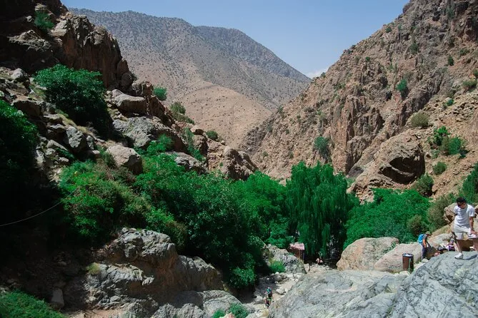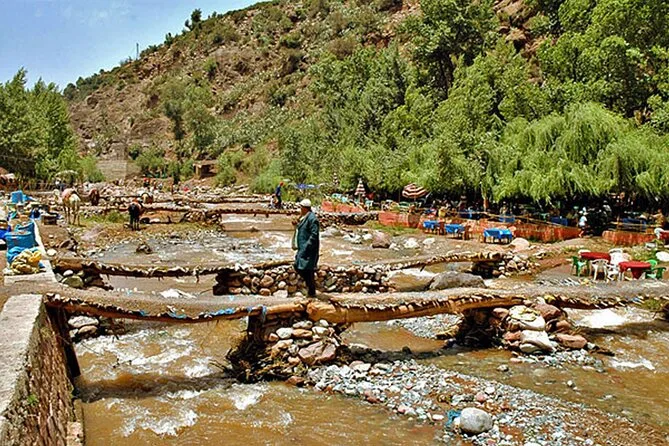 Dein Tag beginnt mit der Abholung vom Hotel oder Riad in Marrakesch, gefolgt von einer malerischen Fahrt durch die Ausläufer des Atlasgebirges mit einem lizenzierten lokalen Fahrer-Guide, der Englisch, Französisch und Arabisch spricht. Du besuchst Berberdörfer, darunter eine Frauen-Kooperative für Arganöl (mit viel Minztee), machst eine entspannte Wanderung zu den Setti Fatma Wasserfällen und hast Zeit für ein optionales Mittagessen am Fluss, bevor es zurück in die Stadt geht.