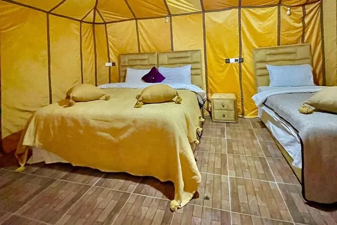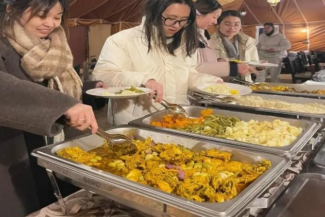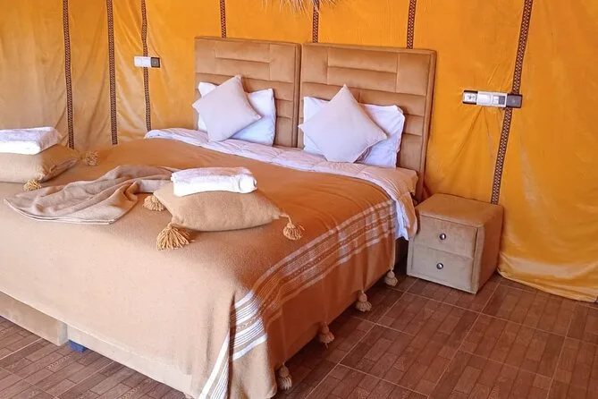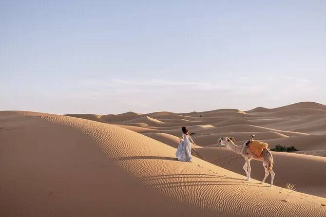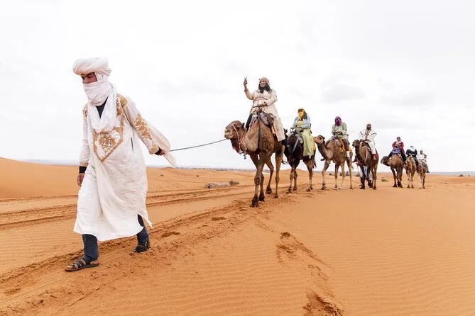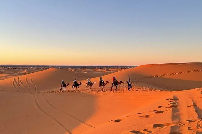 Deine Reise beinhaltet den Hoteltransfer in Merzouga, einen geführten Kamelritt durch die Erg Chebbi Dünen zu einem gemütlichen Wüstencamp mit traditionellem marokkanischem Abendessen und Frühstück, optionales Sandboarding, Berber-Trommelmusik unter dem Sternenhimmel sowie Sonnenaufgang und Sonnenuntergangserlebnisse, bevor du nach dem Frühstück zurückreittest.