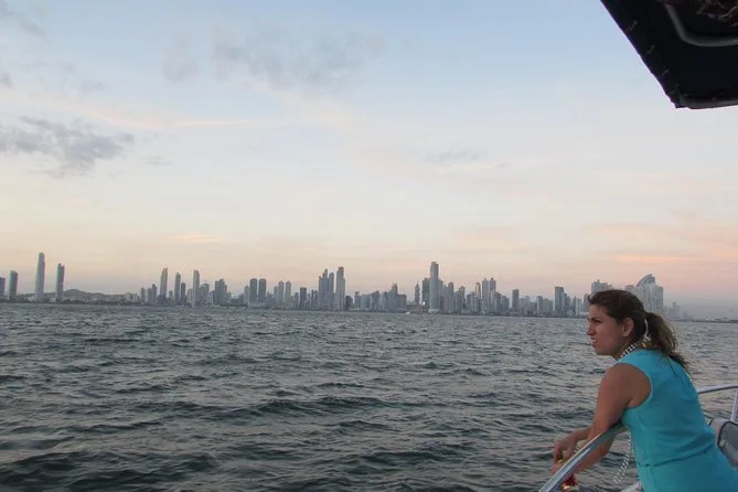 Du siehst die Skyline von Panama City, die Brücke der Amerikas, große Schiffe vor dem Kanaleingang, die Marinas am Causeway und vielleicht auch lokale Tierwelt.