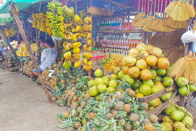Du probierst lokale Früchte wie Ananas und Lanzones an Obstständen und genießt Spezialitäten auf dem Markt.