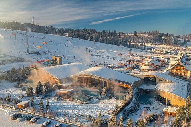 Dein Tag umfasst die Abholung vom Hotel in Krakau, Hin- und Rückfahrt im Minivan oder Auto, Eintritt zu den Chocholow Thermalquellen (inklusive Pools und Rutschen) und zur Gubałówka-Standseilbahn sowie eine Verkostung von traditionellem Oscypek-Käse mit polnischem Wodka in einer Hirtenhütte – danach geht’s entspannt zurück.