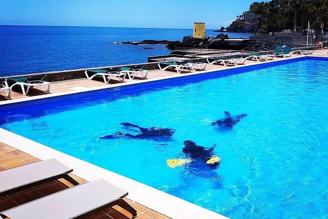 Ich hätte nicht gedacht, dass mein Herz schon beim Sitzen am Pool auf Madeira so heftig klopft. Doch da saß ich, hielt mich am Beckenrand fest und hörte unserem Instructor João zu, wie er erklärte, wie man unter Wasser atmet. Der Neoprenanzug fühlte sich anfangs eng und ungewohnt an – fast wie eine zweite Haut, die einem nicht passt – aber João machte immer wieder kleine Witze über „Fischmode“, und das half, meine Nervosität zu vertreiben. Der Geruch von Chlor mischte sich mit der salzigen Meeresluft, die vom Atlantik herüberwehte. Lustig, wie ernst man sich fühlt, bis man das erste Mal das Gesicht unter Wasser steckt und merkt: Es ist einfach nur Atmen – nur eben in einer ganz anderen Welt.