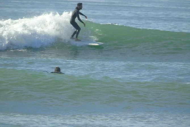 Die ersten Minuten dienten dem Aufwärmen und dem gemeinsamen Lachen über unsere wackeligen Versuche, auf trockenem Boden das Gleichgewicht zu halten. Unser Guide – Pedro – sprach perfektes Englisch (und wechselte für meine Freundin ins Französische), sodass wir jeden Schritt genau verstanden. Auf dem Wasser war er nie weit weg, rief uns Mut zu zwischen den Wellen und gab hilfreiche Tipps, die wirklich Sinn machten. Die Wellen hier sind nicht zu wild; genau richtig zum Lernen und trotzdem aufregend, wenn man endlich eine erwischt. Ich werde nie den Moment vergessen, als ich zum ersten Mal Richtung Ufer glitt – das Wasser ist anfangs kalt, doch sobald man in Bewegung ist, spürt man es kaum noch.