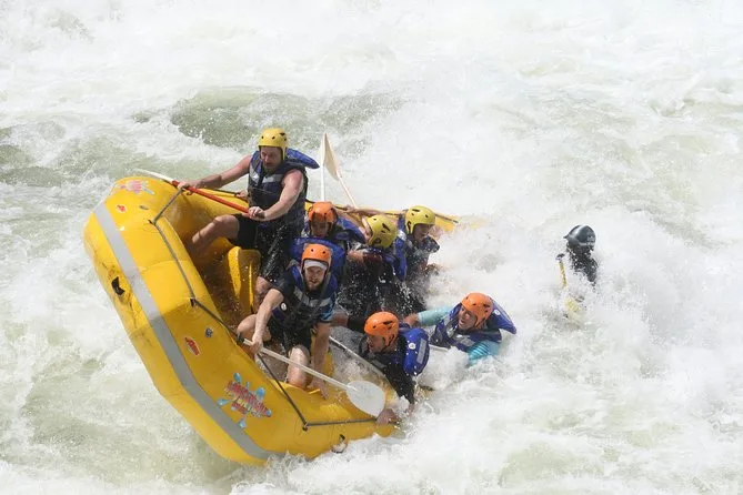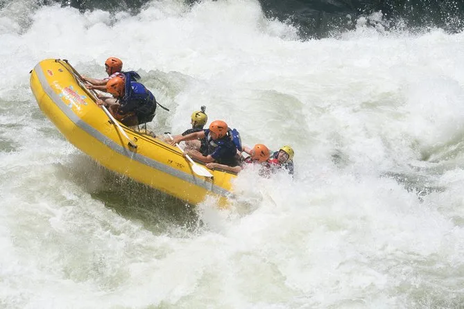 Der Ganztagesausflug umfasst Hotelabholung, Sicherheitseinweisung, Rafting durch mehrere Stromschnellen unter den Victoriafällen, Mittagessen oben an der Schlucht und Rücktransfer.