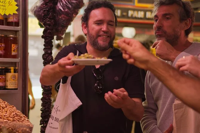 Als Nächstes ging es zum Atarazanas Markt, und ehrlich gesagt, hat es mich sofort umgehauen – das Stimmengewirr (im besten Sinne), Rufe der Fischverkäufer, dieser salzige Duft von frischem Fisch gemischt mit so reifen Früchten, dass man sie beim Vorbeigehen fast schmecken konnte. Wir probierten Oliven, die so intensiv waren, dass mein Kiefer sich zusammenzog (im positiven Sinn?), dann reichte mir Carmen ein Stück Iberischen Schinken, das auf der Zunge zerging, bevor ich überhaupt kauen konnte. Sie lachte, als ich bei den Anchovis zögerte – „Keine Sorge, die sind echt.“ Ich hätte nie gedacht, dass ich sie mögen würde, aber… jetzt tue ich es.