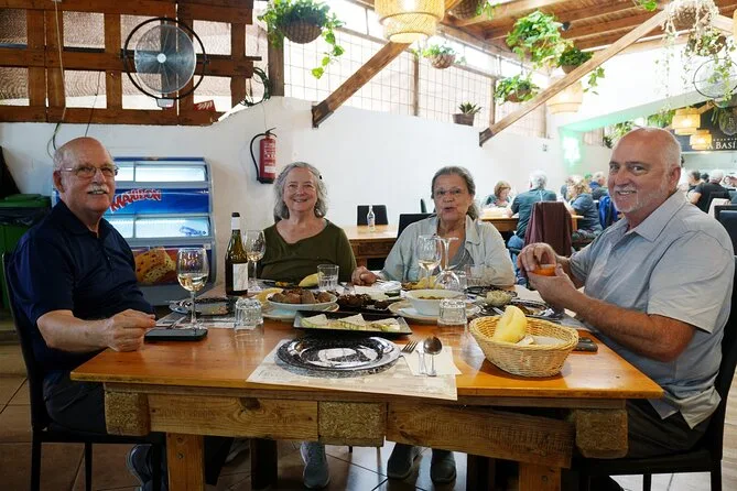 Zum Mittagessen hatten wir freie Wahl und entschieden uns für eine guachinche am Straßenrand – ein typisches Lokal. Dort probierten wir papas arrugadas mit Mojo-Saucen und gegrillten Ziegenkäse, der zwischen den Zähnen knirschte. Wer Lust auf was Ausgefallenes hat, sollte das carne de cabra guisada probieren – langsam geschmortes Ziegenfleisch, kräftig im Geschmack und absolut lohnenswert. Der Hauswein war auch ziemlich gut.