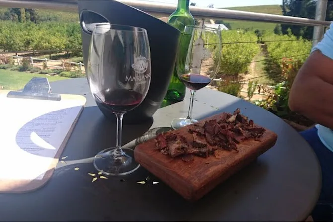 Ja, es gibt Käse & Wein an einem Weingut und Biltong & Wein (oder Schokolade & Wein für Vegetarier) an einem anderen.