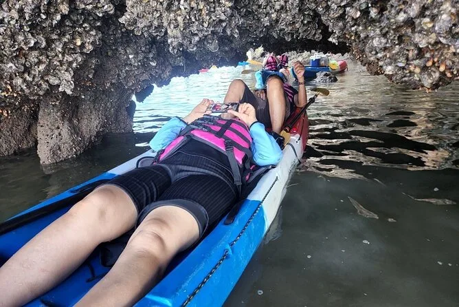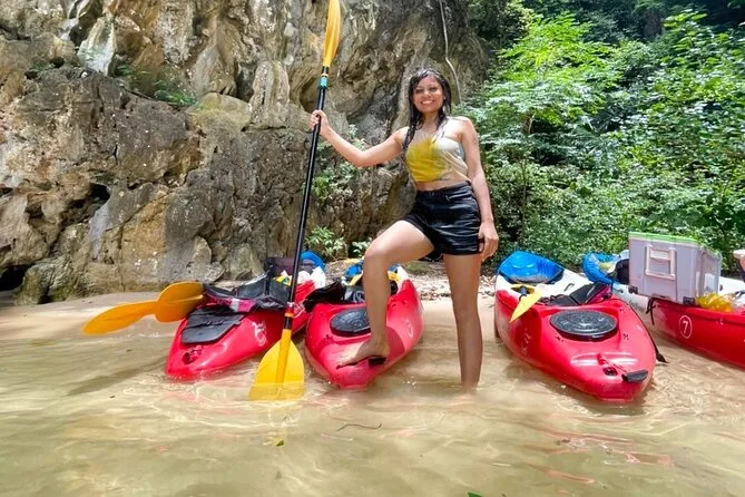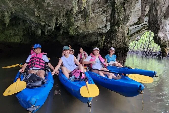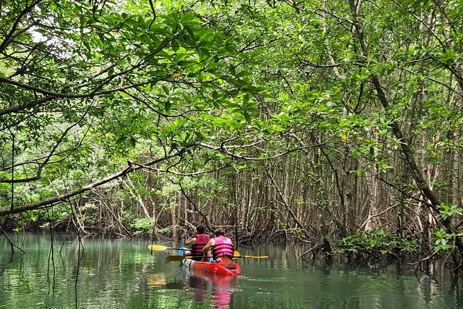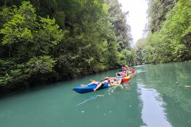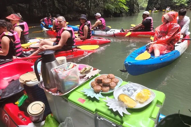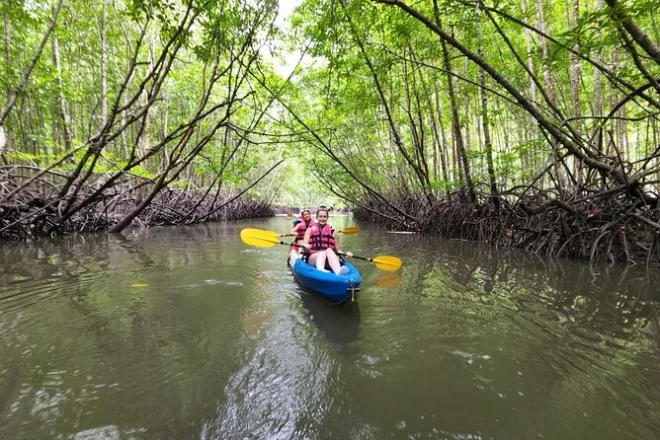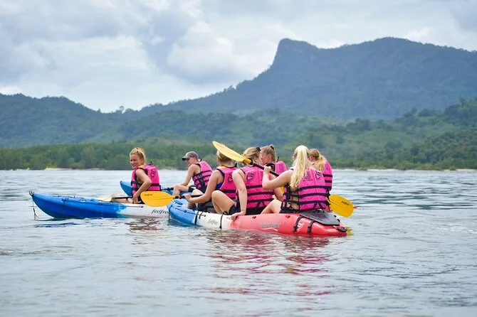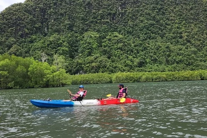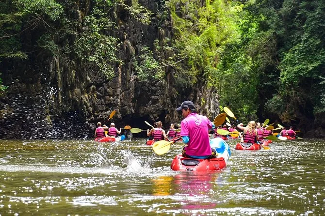 Dein Tag umfasst die Abholung vom Hotel in Krabi, die komplette Kajakausrüstung mit Sicherheitswesten falls gewünscht, die Begleitung durch einen freundlichen lokalen Guide durch Ao Thalanes Mangroven und Schluchten sowie traditionelle Thai-Desserts wie Klebreiskuchen, saisonales Obst und frische Kokosnuss vor der Rückfahrt.
