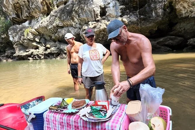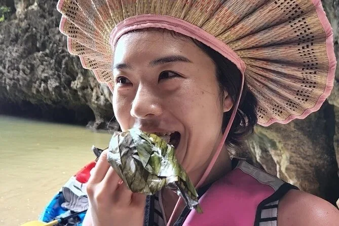 Ich hatte erwartet, mehr Leute zu sehen, aber meistens waren wir allein oder mit ein paar anderen Kajaks ganz ruhig unterwegs. An einer Stelle zeigte Somchai winzige Krebse, die auf den Wurzeln herumhuschten – die hätte ich sonst nie entdeckt. Er erzählte uns Geschichten über die Gezeiten und wie die Einheimischen die Mangroven zum Fischen nutzen (ich hab nur die Hälfte verstanden, aber wünschte, ich könnte besser Thai). Nach einer Fahrt durch eine enge Schlucht, in der kaum Sonnenlicht aufs Wasser fiel, machten wir eine Pause mit Snacks: Klebreiskuchen in Bananenblättern und frischem Kokosnusssaft. Vielleicht lag’s an der Müdigkeit oder daran, dass Essen draußen einfach besser schmeckt – dieses Dessert war auf jeden Fall etwas Besonderes.