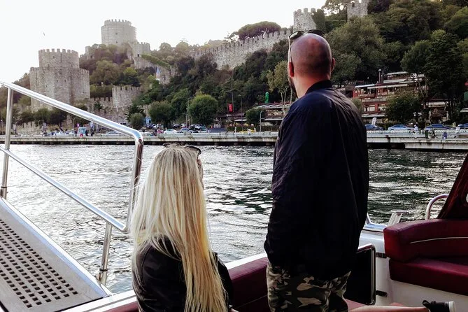 Du siehst den Dolmabahçe-Palast, die Ortaköy-Moschee, die Rumeli-Festung, den Mädchenturm, den Galataturm, das Goldene Horn, mehrere Paläste und beide großen Bosporus-Brücken.