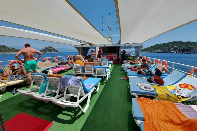 Stundenlang glitten wir zwischen kleinen Inseln und grünen Buchten hindurch. An einer Stelle sprangen einige sofort ins Wasser (das war kälter als gedacht), während andere sich auf den Sonnenliegen ausstreckten und die Brise genossen. Das Mittagessen war einfach, aber lecker – gegrilltes Hühnchen, Salat, Brot – nichts Aufwendiges, aber genau das Richtige nach dem Schwimmen. Ein besonderer Moment war, als wir über ein altes Schiffswrack bei Marmaris schwebten; seine Umrisse waren durch den blauen Dunst unter uns zu erkennen. Unser Guide erzählte leise Geschichten darüber, sodass man sich vorbeugen musste, um sie über das Motorengeräusch hinweg zu hören.