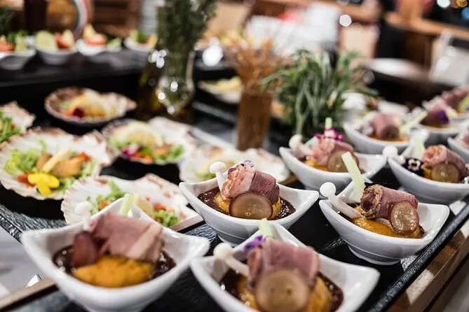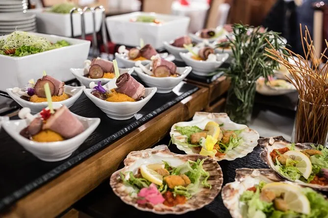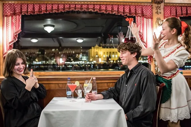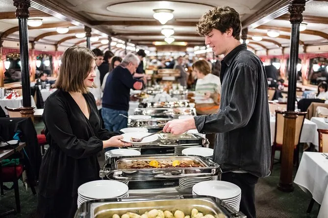 Dein Abend umfasst eine 90-minütige Donau-Schifffahrt durch das Zentrum von Budapest mit einfachem Einsteigen nahe öffentlicher Verkehrsmittel; ein ungarisches Buffet mit Salaten, Suppen wie Gulasch oder Gemüsebrühe, Hauptgerichten wie Rindereintopf oder Putenfilet (plus vegetarische Alternativen), Desserts wie Strudel und Somlói Torte; einen Begrüßungsdrink plus Wahl zwischen Bier, Wein oder Softdrink; Live-Musik von Mitgliedern des Rajko Folk Orchesters; WLAN an Bord; Toiletten; und bei Wunsch eine Weinverkostung mit Proben vor der Rückkehr ans Ufer gegen 20:45 Uhr.