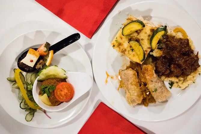 Kaum hatten wir Platz genommen, begann das Rajko Folk Orchestra zu spielen. Nur drei Musiker, aber ihre Musik füllte das ganze Schiff. Unsere Reiseleiterin – ich glaube, sie hieß Anna? – erzählte zwischen Bissen vom Strudel zu jedem Lied etwas (sie meinte, das Rezept ihrer Oma sei besser – ich glaubte ihr sofort). Einmal versuchte jemand mitzuhalten und verlor völlig den Takt, was die Hälfte unseres Tisches zum Lachen brachte. Das Essen war herzhaft: Rindereintopf mit Knödeln, die die Sauce aufsogen, frische Salate und diese kleinen Käsebissen, von denen ich immer wieder heimlich nachnahm. Mit dem gefüllten Kohl hätte ich so gar nicht gerechnet, aber ich mochte ihn sehr.