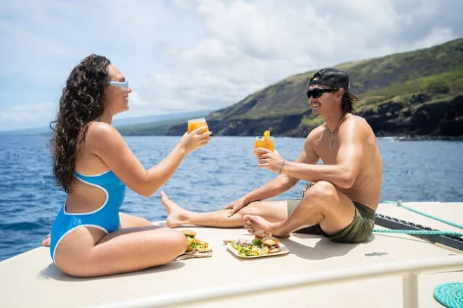 Schwimme in glasklarem Wasser der Kealakekua Bay und entdecke wilde Lava-Riffe entlang der rauen Kona-Küste – geführt von Einheimischen, die jede Geschichte und jeden Geheimtipp kennen. Genieße an Bord ein frisches, pflanzliches Mittagessen nach dem Schnorcheln mit tropischen Fischen oder vielleicht sogar Schildkröten. Die salzige Meeresluft bleibt lange nach dem Aussteigen in der Erinnerung – dieser Tag hinterlässt Spuren.