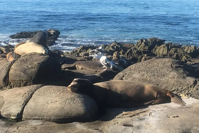 Der erste richtige Halt war der Ellen Browning Scripps Park. Es hat etwas Faszinierendes, Seelöwen direkt neben Selfie-machenden Leuten herumwatscheln zu sehen – da merkt man erst, wie entspannt Kalifornien wirklich ist. Unser Guide zeigte uns alte Wandmalereien, die noch aus der Zeit stammen, als hier eine Künstlerkolonie war – die hätte ich sonst glatt übersehen. Am Children’s Pool Beach gab es auch Robben, und ja, es roch ein bisschen fischig, aber genau das gehört hier irgendwie dazu. Ich habe versucht, ein Foto ohne Ellenbogen im Bild zu machen, hab’s aber aufgegeben und sie lieber einfach eine Weile beobachtet.