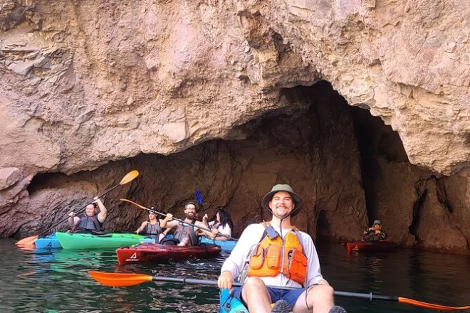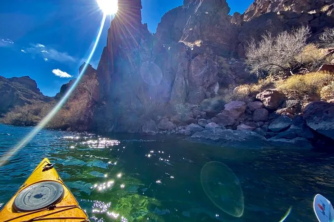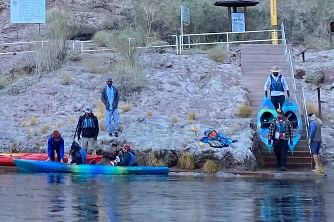 Dein Morgen startet mit optionaler Abholung vom Las Vegas Strip, inklusive kompletter Kayak-Ausrüstung und Sicherheitsausrüstung, Wasserflaschen und Snacks am Fluss sowie Eintrittsgeldern bei Nutzung des Transports – du brauchst nur Sonnencreme und eventuell trockene Kleidung für nach dem Schwimmen am Willow Beach.