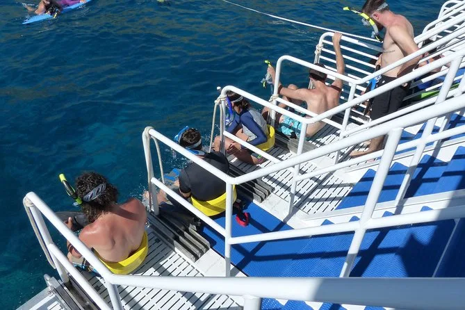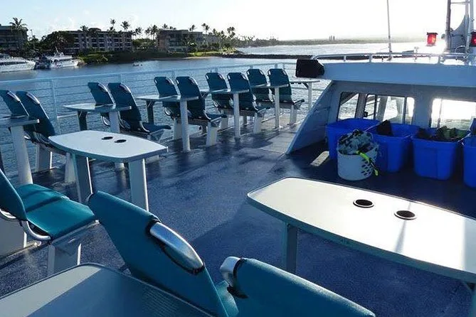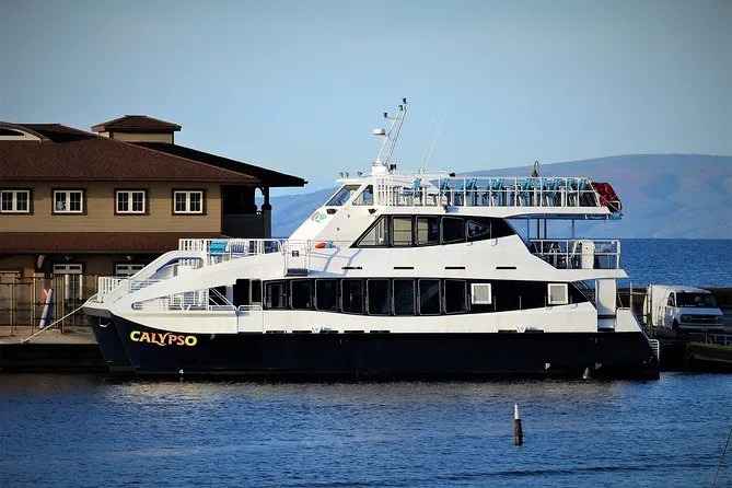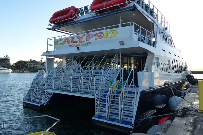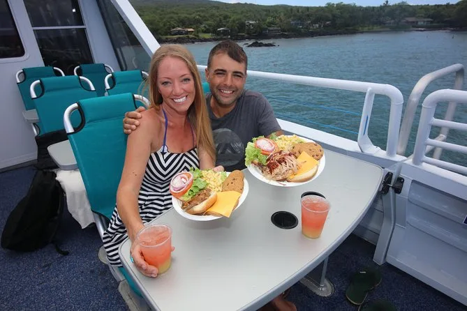Steig an Bord eines lebhaften Katamarans auf Maui für Schnorcheln am Molokini-Krater zwischen bunten Rifffischen und entdecke Turtle Town mit eleganten Meeresschildkröten. Genieße Frühstück und Mittagessen an Bord, entspanne auf den Rutschen oder im Glasbodenzimmer. Freu dich auf viel Spaß, salzige Haare und unvergessliche Momente.