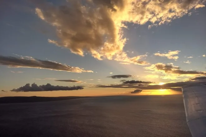 Die genaue Dauer ist nicht angegeben, aber es werden mehrere Küstenhighlights bei Sonnenuntergang überflogen.
