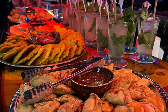 Du bekommst eine Verkostung von kubanischen Empanadas, venezolanischen Käsebällchen (Tequeños) und karibischen Tostones mit Dips.