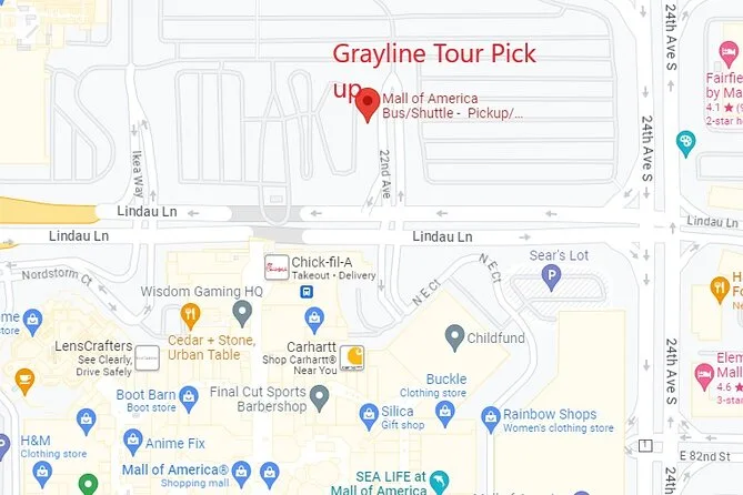 Der Hauptabholpunkt ist um 10:00 Uhr am Mall of America; weitere Abholungen auf Anfrage im Hilton Hotel (Downtown Minneapolis) um 9:00 Uhr und im The St. Paul Hotel (Downtown St. Paul) um 10:40 Uhr.