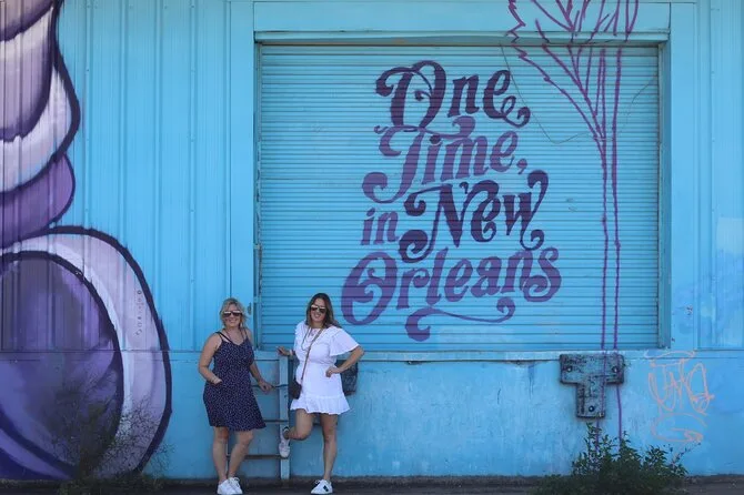 Ich hätte nie gedacht, dass unser Guide Derrick sofort Louis Armstrong anstimmt, sobald wir losfahren. Es war, als würde die Stadt direkt aus ihm herausströmen. Kaum hatten wir das French Quarter verlassen, zeigte er auf ein Wandbild, das mir bei meinen zwei früheren Besuchen nie aufgefallen war. Wie er die Farben beschrieb – „als hätte jemand Mardi Gras über die Wand gekippt“ – brachte mich zum Schmunzeln. Er machte ein Foto von uns davor, und selbst mein Zusammenkneifen der Augen sah irgendwie besser aus als sonst.