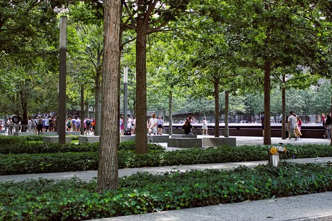 Du siehst St. Paul’s Chapel, das Oculus, die Gedenkbecken von Ground Zero, die FDNY Gedenkwand, Liberty Park mit The Sphere und den Survivor Tree.