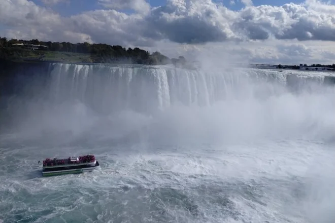 Als nächstes stand der Cave of the Winds Walk auf dem Programm – wir zogen die knallgelben Ponchos an, die uns wie Gummienten aussehen ließen. Der Holzsteg war an manchen Stellen glatt (Mark hatte uns gewarnt), aber man ist so nah am Wasser, dass man den scharfen, metallischen Geruch förmlich schmeckt. Ein Moment, der hängen bleibt: Du drehst dich zum Horseshoe Falls und für einen Augenblick ist alles weiß vom Sprühnebel. Meine Brille beschlug komplett, ich stand einfach da und hörte nur das Tosen des Wassers gegen die Felsen. Danach wärmten wir uns mit Stampfen bei den Three Sisters Islands wieder auf, während Mark von waghalsigen Abenteurern erzählte, die versuchten, die Stromschnellen zu überqueren – einer soll es sogar im Fass geschafft haben! Verrückte Typen.