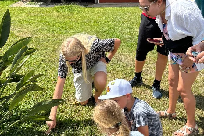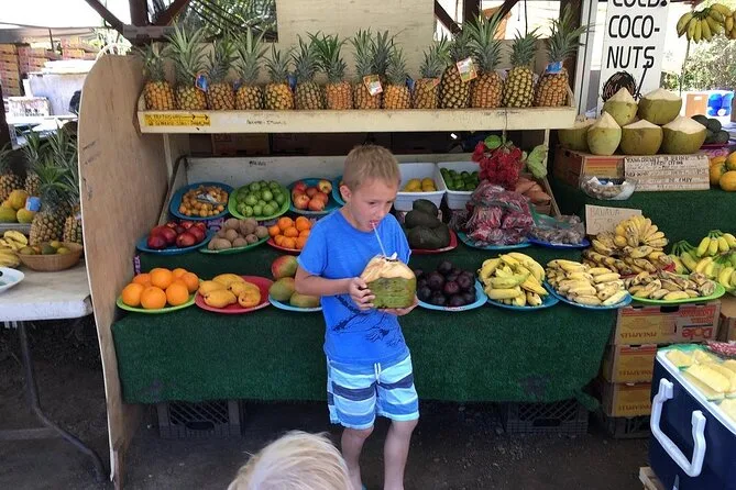 Das Mittagessen findet auf einer lokalen Farm statt mit Gerichten wie Knoblauchgarnelen, Kokosgarnelen, Kalua-Pork und vegetarischen Optionen; bitte Bargeld mitbringen.