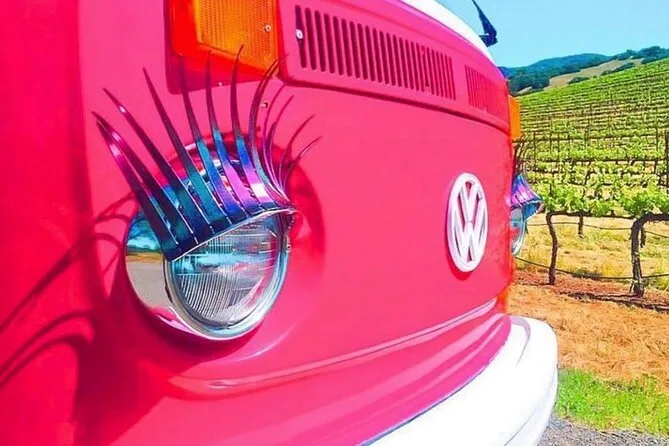 Dein Tag startet mit der Abholung am Union Square oder Fisherman’s Wharf in San Francisco, alle Fahrten erfolgen in einem Vintage VW Bus mit Wasserflaschen und kleinen Snacks. An der Golden Gate Bridge gibt’s kostenlose Mimosas, dazu geführte Weinproben in drei ausgewählten Sonoma-Weingütern – darunter eine in einer stimmungsvollen Weinhöhle – und ein entspanntes italienisches Mittagessen mit vielen Auswahlmöglichkeiten, bevor es gemeinsam zurück in die Stadt geht.