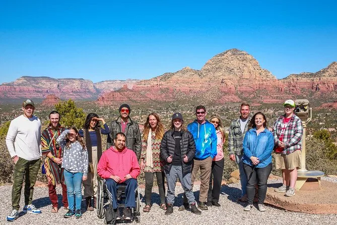 Dein Tag umfasst eine Fahrt in einem offenen Fahrzeug mit Sonnenschutz und Live-Kommentar eines erfahrenen lokalen Guides; du hältst an malerischen Orten wie dem Airport Overlook, der Amitabha Stupa und dem Peace Park, Soldier’s Pass, Cathedral Rock für Fotos sowie Thunder Mountain und Coffee Pot Rock – alles familienfreundlich, auch für Babys und mit Assistenztieren.